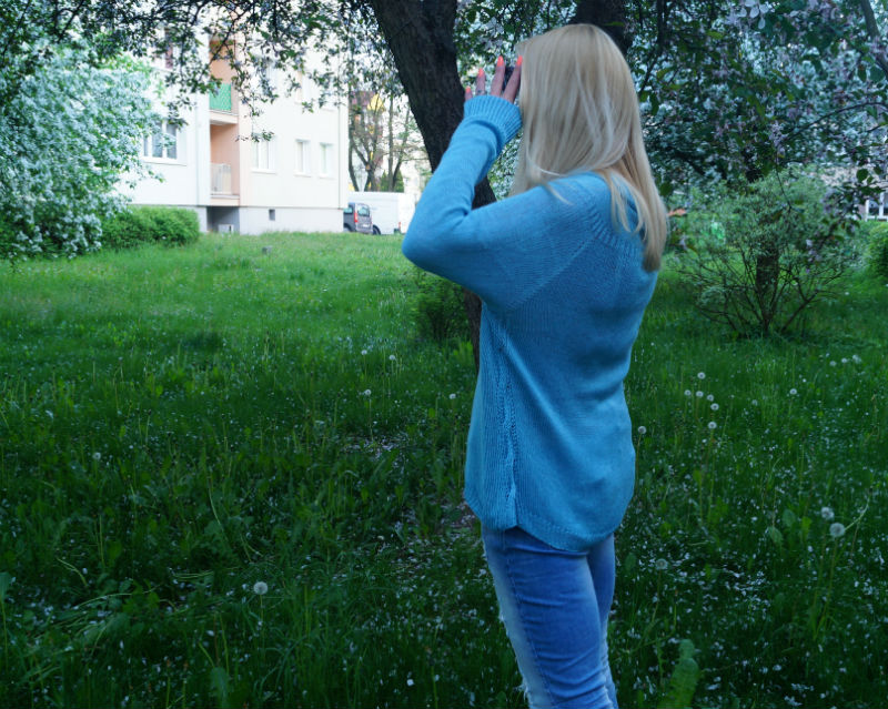 wzór Stormwind Marzeny Krzewińskiej z modyfikacjami – dłuższe rękawy, bez ozdobnej patki i golf dorobiony przy dekolcie.